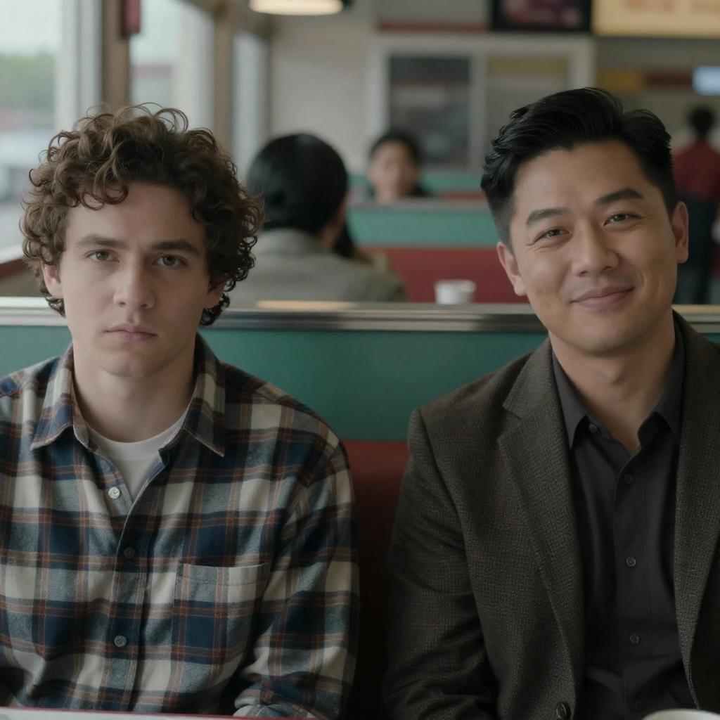 Two men stand in a modern kitchen with tiled walls and metal appliances. The man on the left, wearing a light blue shirt and black vest, drinks from a cup with a straw. The man on the right has short dark hair, wears a white shirt with a blue heart emblem, and leans on the counter. The stainless steel counter features condiment bottles and a red Coca-Cola sign. Kitchen utensils and containers are visible on shelves in the background.