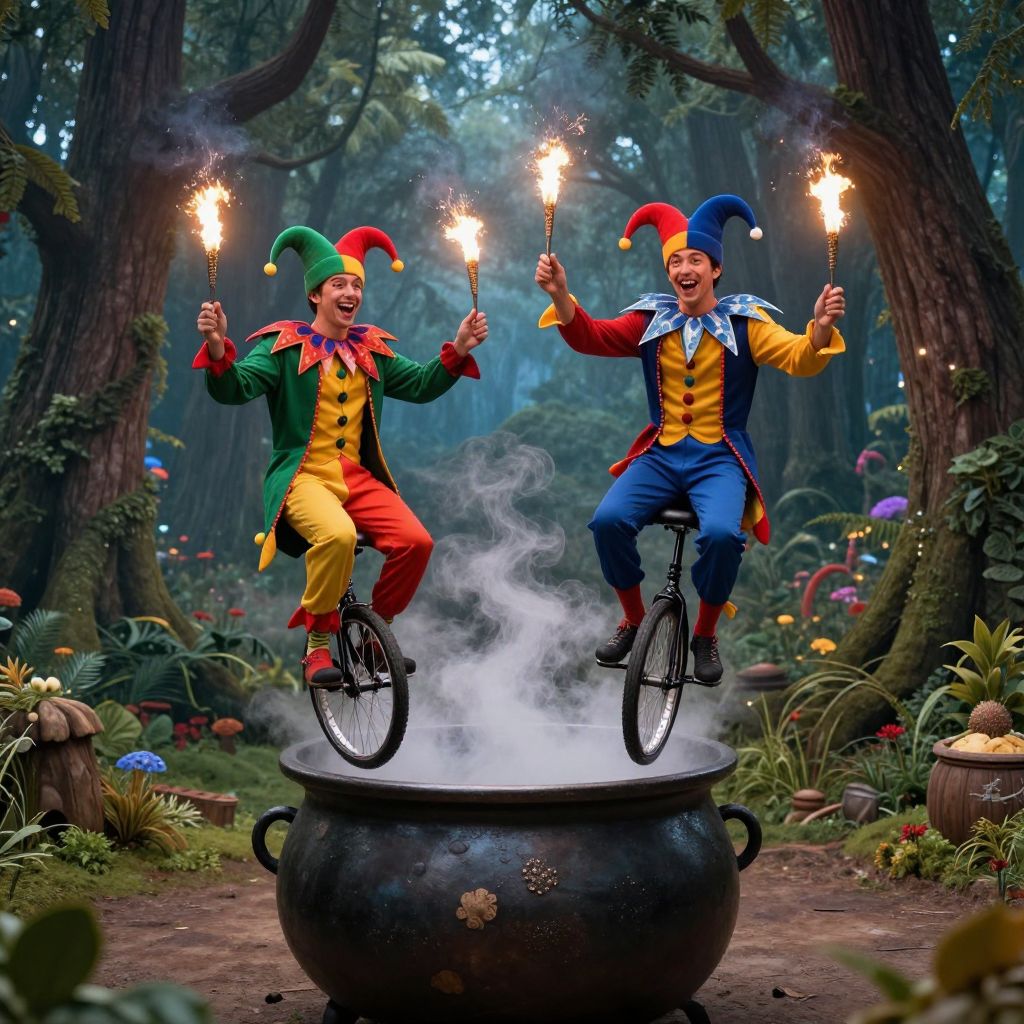 Two whimsical jesters, adorned in vibrant costumes and jester hats, joyfully ride unicycles atop a massive, steaming cauldron while juggling fiery sparklers, defying gravity and reality in a magical forest setting.