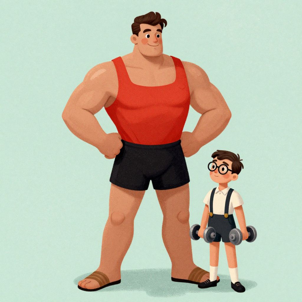 Digital illustration in a cartoon style. A large, muscular man with a black beard and long black hair, wearing a simple white tunic, stands confidently in front of a classical white marble temple with Corinthian columns. His tunic clings to his broad chest and large belly. A small, slim man with short brown hair, dressed in a white shirt, black tie, and black pants, walks past him from left to right. The background includes a bright blue sky and a clear, sunlit day. The temple's columns and the man's size create a striking contrast.
