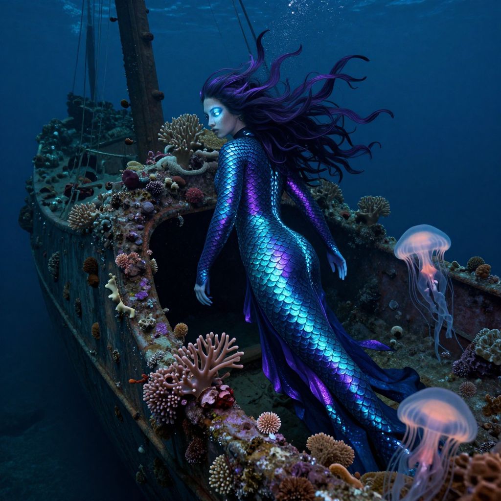 A portrait of an enigmatic underwater figure with scales glowing in mesmerizing shades of deep-sea blue and purple rests upon an antique shipwreck adorned with lush coral growths. The scene is captured from a distinctive vantage point that emphasizes the intricate details of her flowing, kelp-like hair, softly lit by the ethereal glow of nearby jellyfish. Her reflective eyes hint at the mysteries she holds, captivating viewers as she stands amid the remnants of human history in an atmosphere reminiscent of James Jean's artwork, combining haunting beauty with a somber tone.