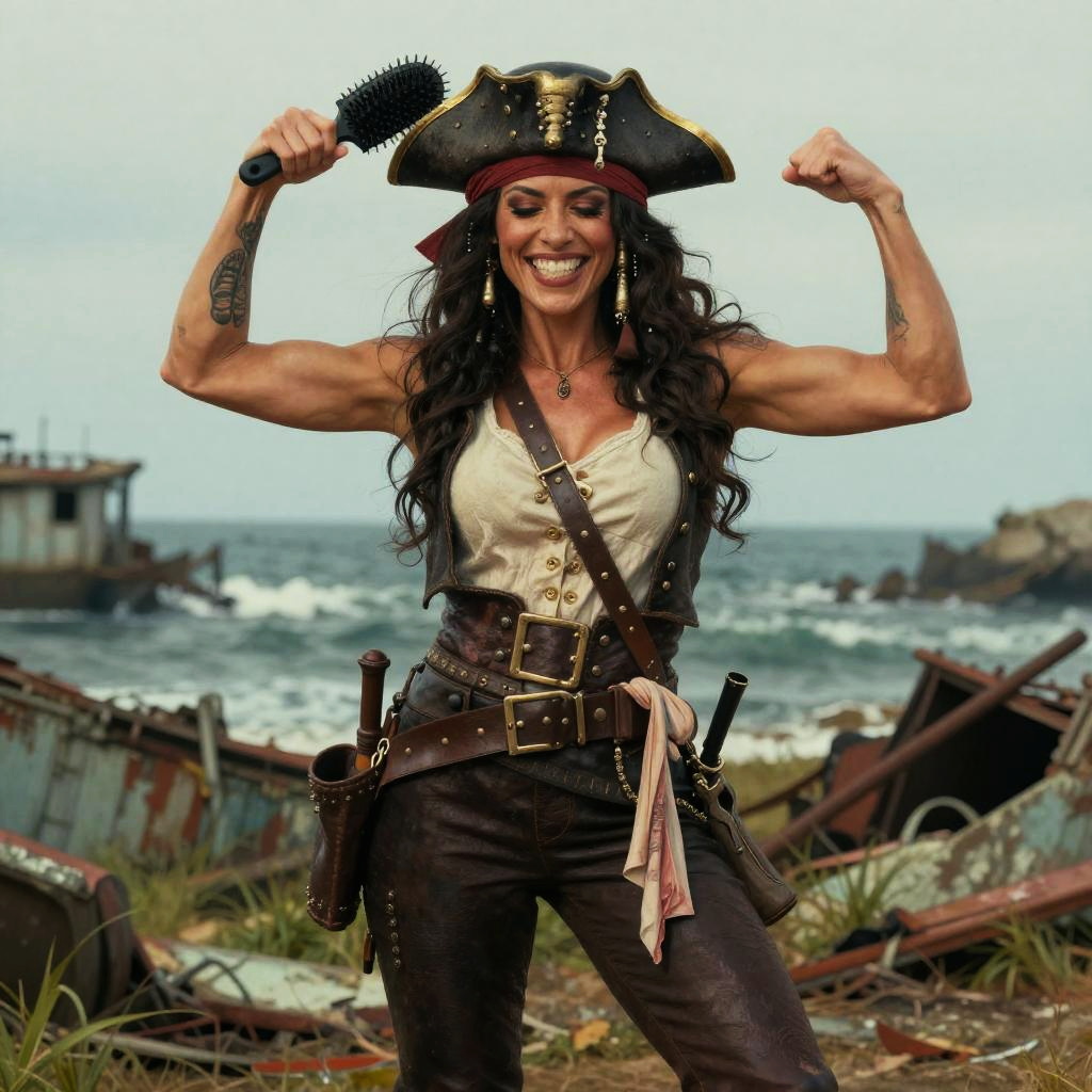 Photograph of a muscular woman with long, curly black hair, wearing a pirate hat with a red band, white sleeveless top, brown leather belt, and pants with various tools attached. She flexes her biceps, smiling, against a backdrop of a stormy ocean with wrecked ships and grassy shore. She holds a black brush in her right hand. The scene is brightly lit with dramatic, overcast sky. Her skin is tan, and she has a tattoo on her right arm. The image has a vibrant, action-packed style.