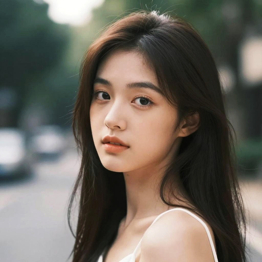 Photograph of a young Asian woman with fair skin and long, straight, dark brown hair, standing poolside in a sunny, tropical setting. She has large, dark brown eyes and full lips, wearing a white, slightly sheer button-up shirt. The background features a clear blue swimming pool, white umbrellas, and blurred greenery with palm trees. The sunlight casts soft shadows, highlighting her serene and focused expression. The image has a sharp, realistic style with vibrant colors and high contrast.