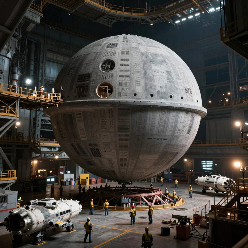Death Star image under construction in an enormous space dock, workers and spacecraft engaged in assembly, illuminated by multiple artificial lights, showcasing sci-fi industrial complexity and scale, concept art with realistic textures and lighting