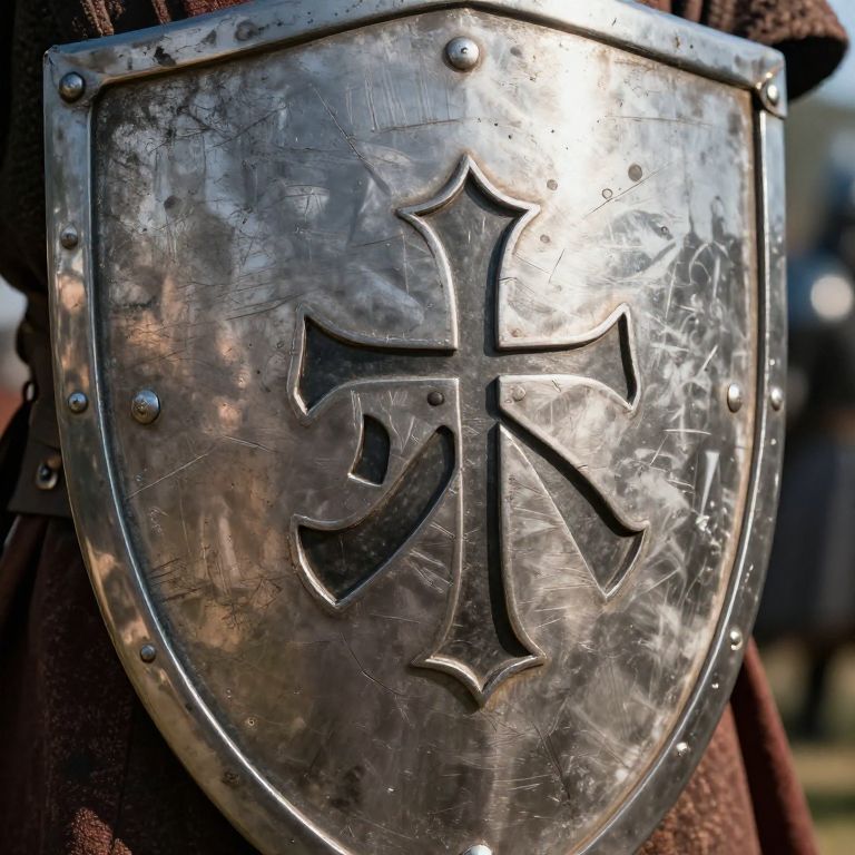Close-up photograph of a shiny, metallic, medieval-style shield with a prominent, raised cross and weathered texture, fastened with rivets.