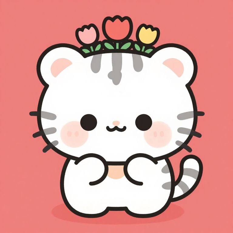 Nanotechnology 8k ultra hd blender illustration of a cute adorable white baby tiger with tulips on its head and adorable, chibi, round features, light red background,