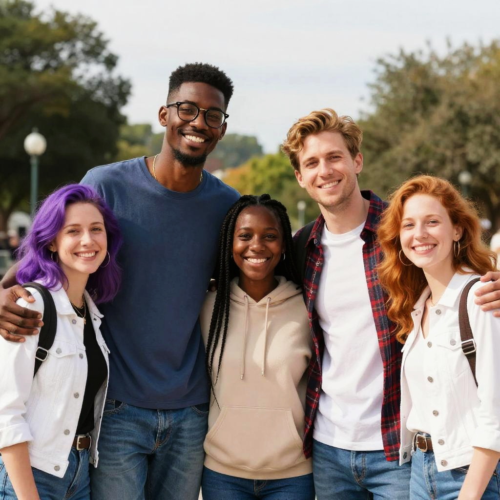 Photograph of five smiling friends standing close together outdoors. From left to right: a woman with purple hair in a white jacket, a tall Black man with glasses in a blue shirt, a Black woman with braids in a beige hoodie, a white man in a white t-shirt with a red plaid shirt, and a red-haired woman in a white jacket. Trees and a bright sky form the background.