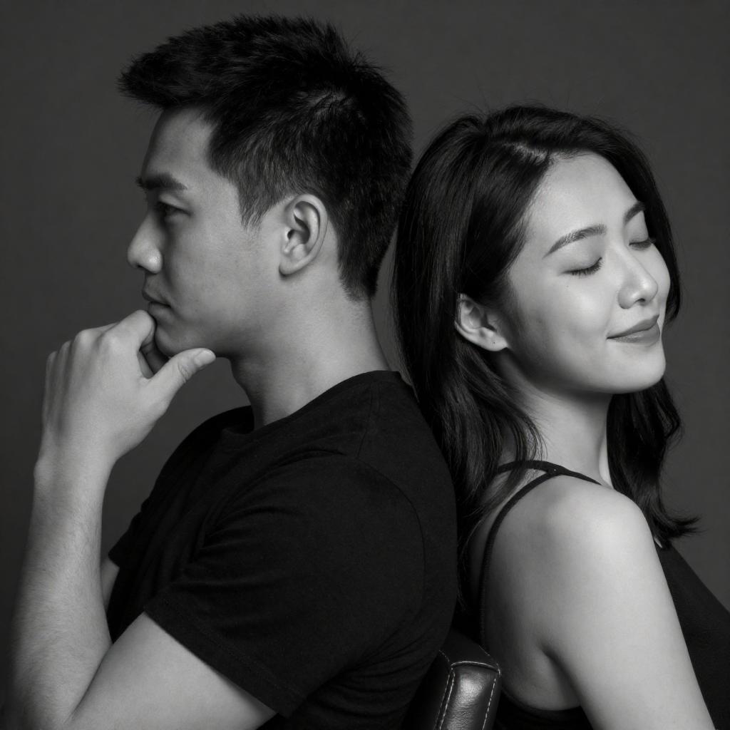 Black-and-white photograph of two blurred, sad-looking Asian individuals. Foreground woman leans on hand with head resting, eyes closed. Background man leans forward, eyes down, hand near face. Reflections in glass create double exposure effect. Dimly lit, indoors.