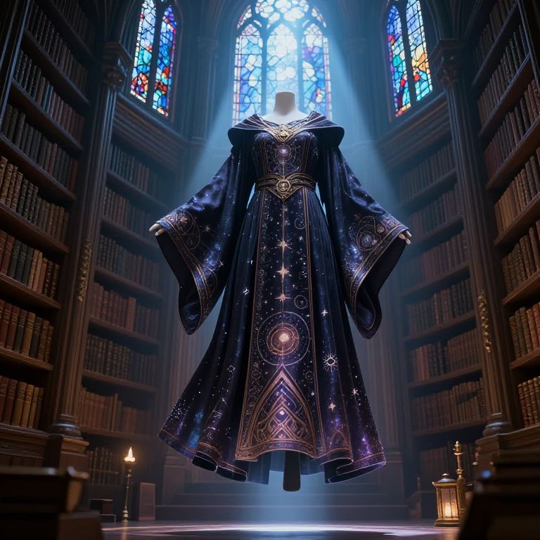 Digital art of a starry, ornate black robe hanging in a dimly lit, Gothic library with sunlight streaming through stained glass windows.