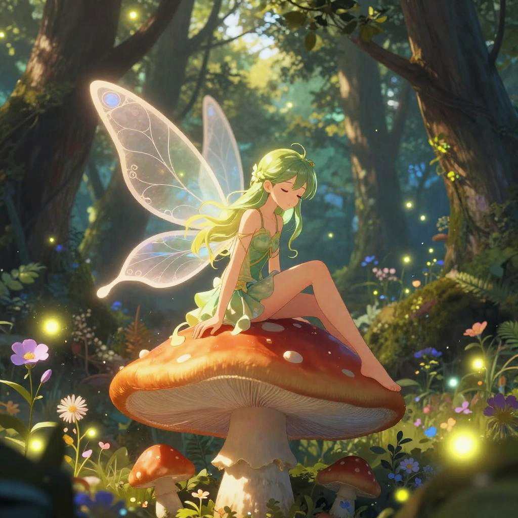 Fairy girl anime sitting on a giant mushroom in an enchanted forest, surrounded by glowing fireflies and delicate flowers, soft light filtering through the trees, intricate wing design and elegant, flowing hair, dreamy and vibrant fantasy ambiance.
