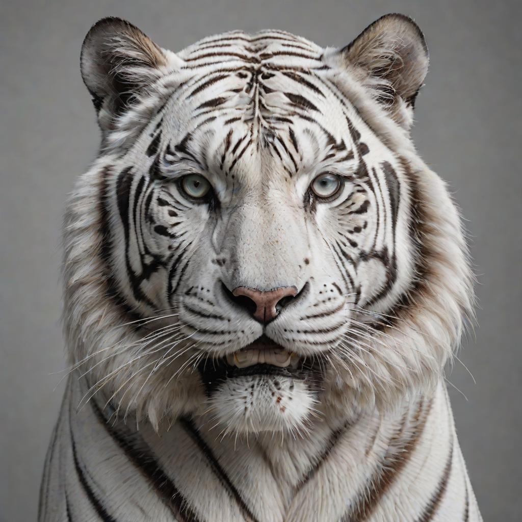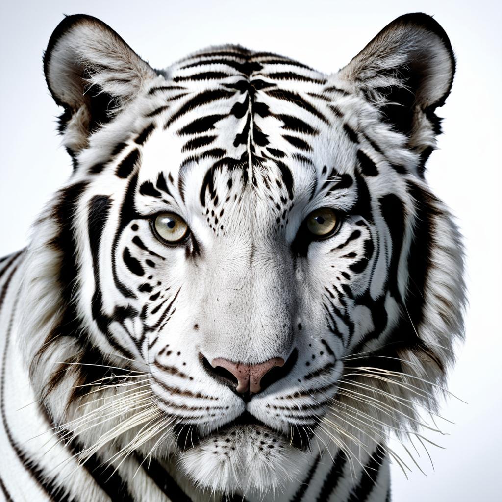 Theatrical Press Release portrait of a majestic white tiger, ultra-realistic fine art photograph in the style of Richard Avedon's striking portraiture. Using a Canon EOS R5 with a telephoto lens, shallow depth of field to blur out the background and focus on the details of the subject. The result should showcase ultra-realistic textures with a minimalistic yet powerful composition.