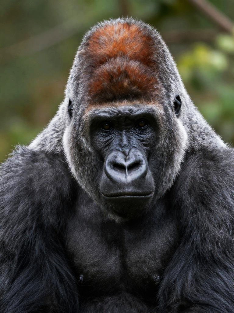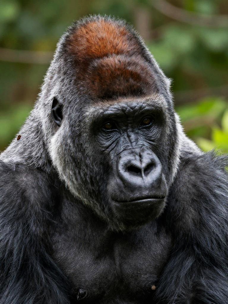 Close-up silverback gorilla portrait, eastern lowland gorilla, dark gray fur with reddish-brown crest, calm thoughtful gaze, highly detailed face with visible texture and wrinkles, soft diffused forest light, soft green bokeh from leaves, natural wildlife photography look, sharp focus on eyes, shallow depth of field, high resolution