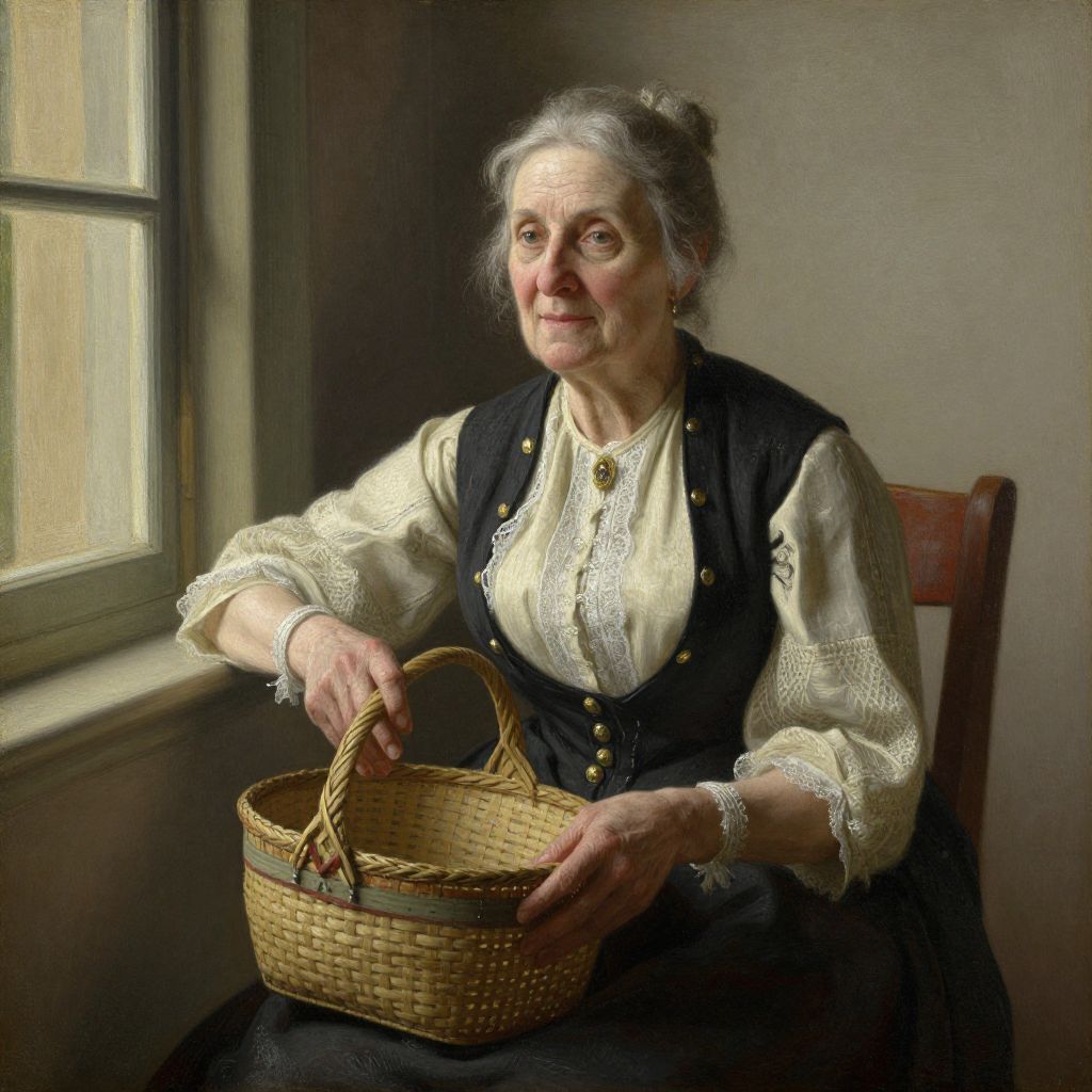 A finely detailed oil painting from 1882 depicts an elderly woman seated by a window, dressed in period attire featuring a cream blouse with lace trim and a dark vest adorned with gold buttons, holding a woven splint basket with a rustic charm, rendered with realistic textures and soft, natural lighting that enhances the vintage aesthetic.