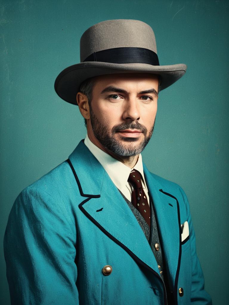 Photorealistic detailed studio portrait of a man wearing a vintage Grant costume. He is dressed in a teal double-breasted coat with black trim and brass buttons, a white shirt, dark patterned tie, gray vest, and a beige hat with a black band. The man has a well-groomed beard and mustache with dark hair and an intense gaze. The background is solid teal, complementing the vintage style and colors of the outfit.