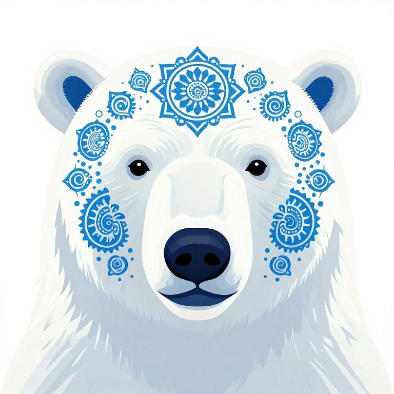 A polar bear's face is adorned with intricate mandala patterns in shades of blue and white.