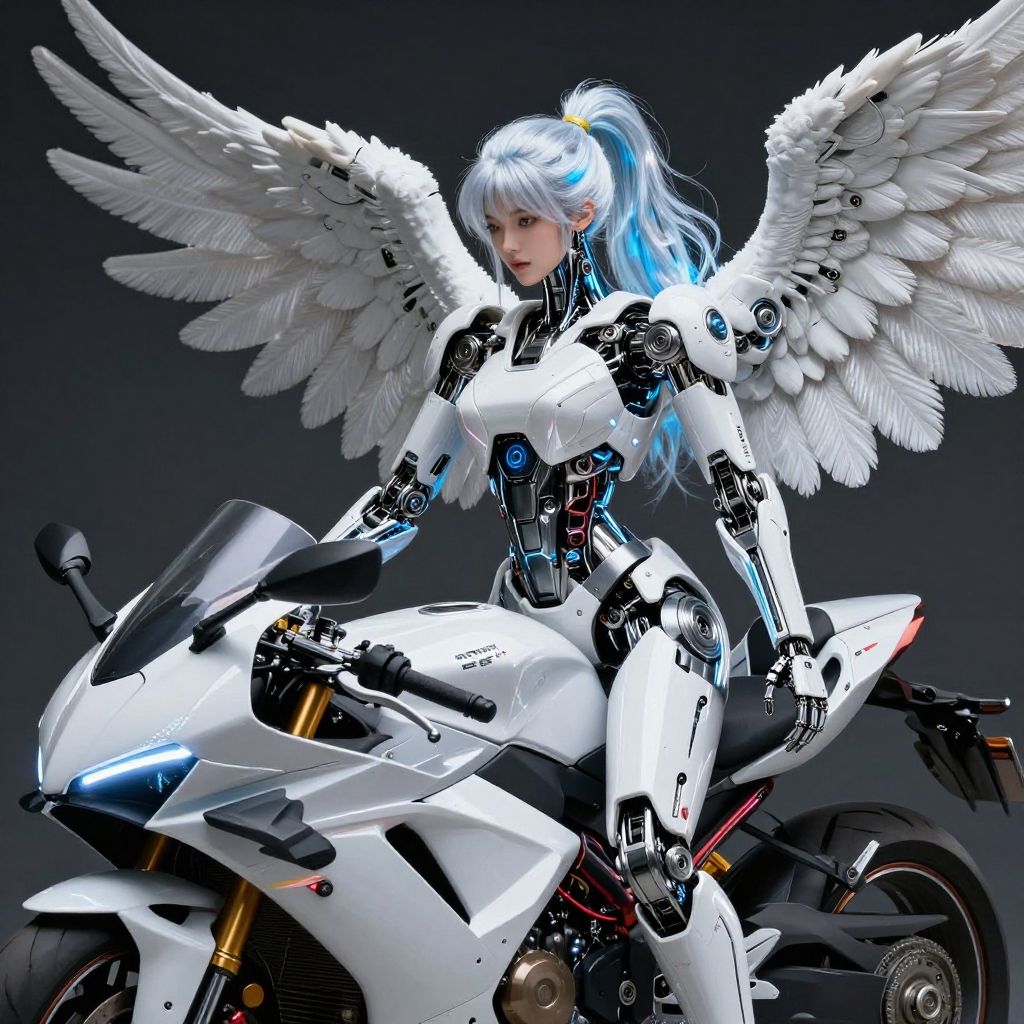 Digital artwork of a cybernetic angel with white wings riding a white sports motorcycle, featuring sleek, metallic armor and blue hair.