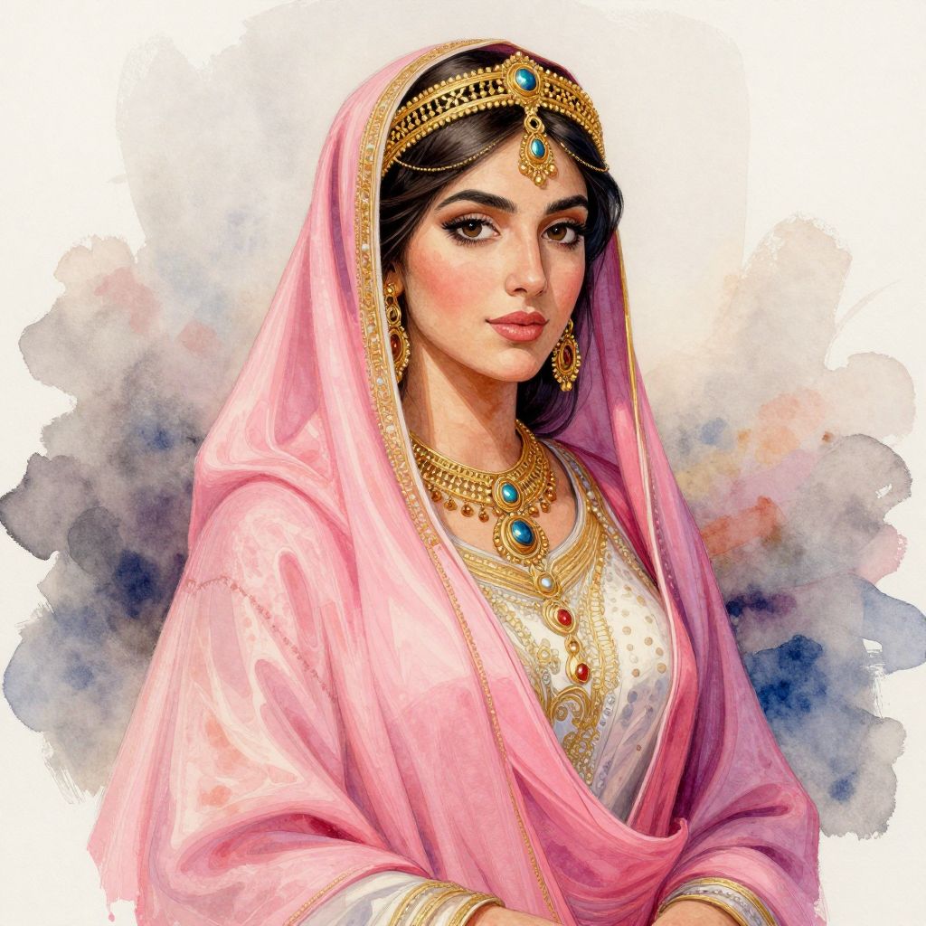 Elegant portrait of an Arab woman, adorned in traditional attire featuring a flowing pink shawl, intricate gold headband, and ornate jewelry, rendered in vibrant watercolor by N. Cipriani, circa 1890.