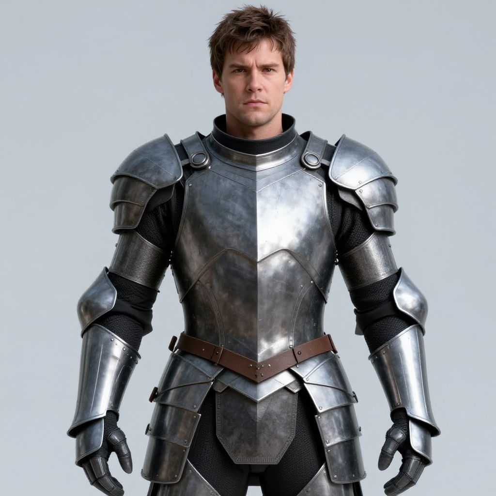 Adult man steel costume, 1boy, male focus, solo, armor, brown hair, arms at sides, realistic, standing, closed mouth