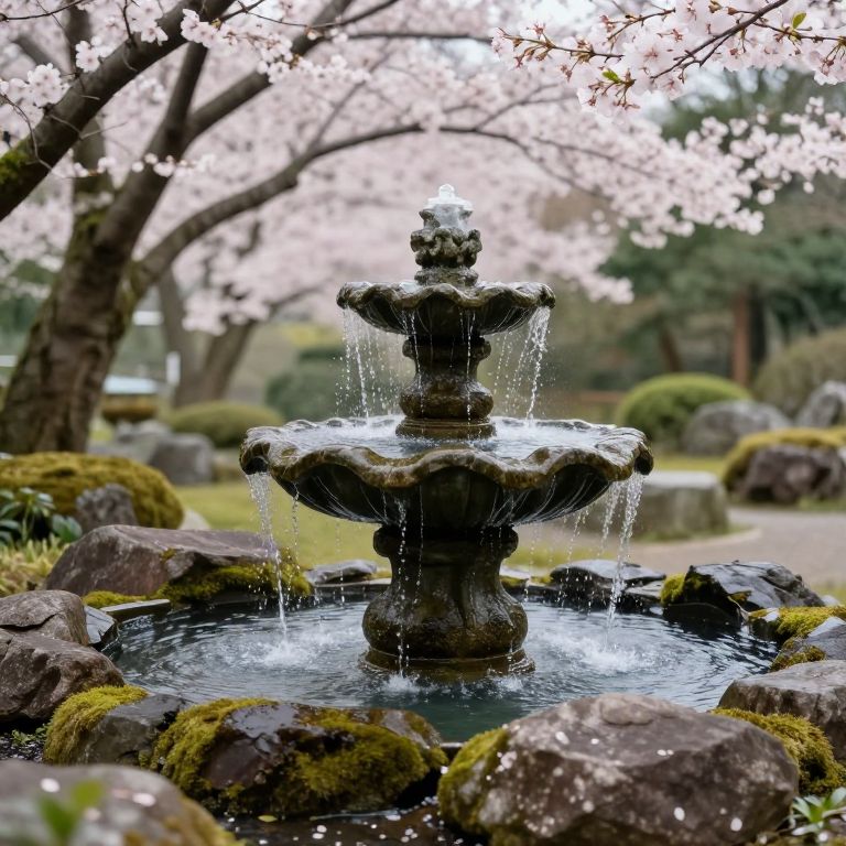 Tiered fountain in a serene Japanese garden, water flowing gently from one level to the next surrounded by moss-covered stones and blooming cherry blossoms, tranquil and harmonious scene with soft natural light
