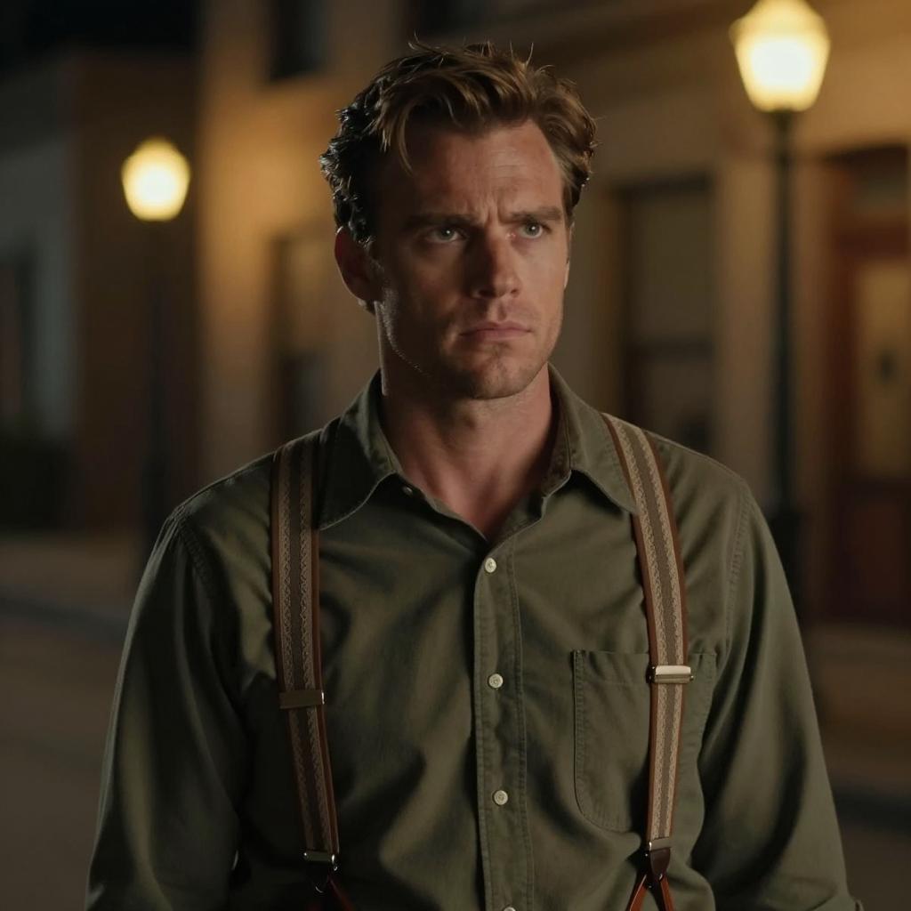Original halloween costume, photorealistic, male, brown hair, serious expression, medium build, olive green button-up shirt, suspenders, nighttime, dimly lit street, blurred yellow street lamps in background, 1920s style buildings, movie still, close-up, CGI, realistic ures, dark and moody atmosphere