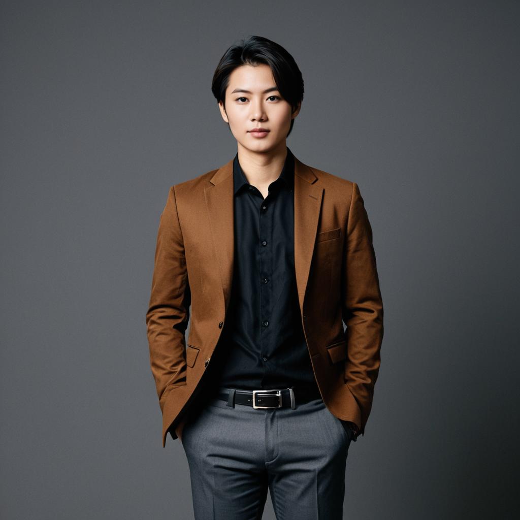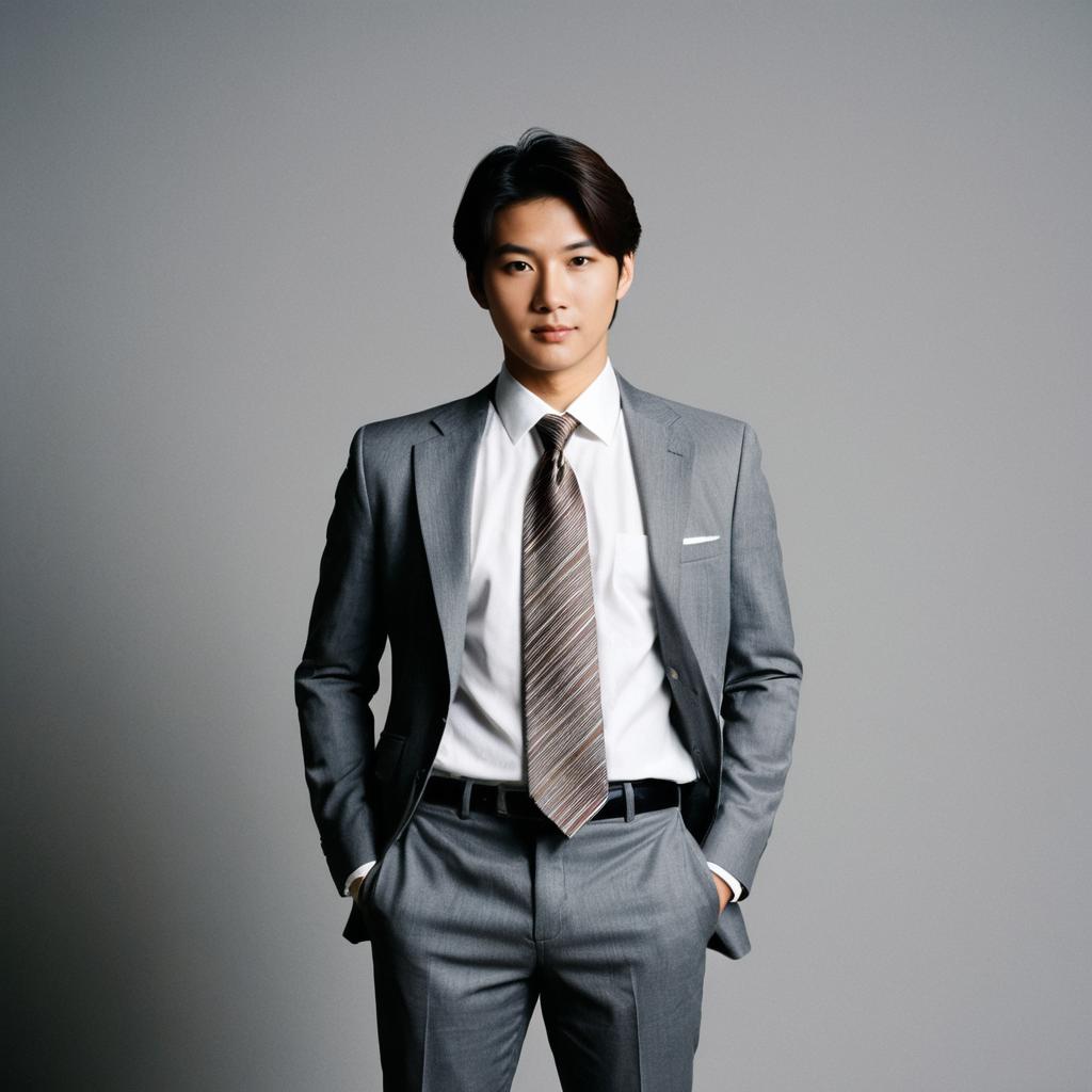 Show semi formal attire,1boy, male focus, solo, necktie, realistic, suit, formal, shirt, white shirt, jacket, grey jacket, collared shirt, pants, looking at viewer, grey pants, standing, brown hair, closed mouth, arms at sides, asian