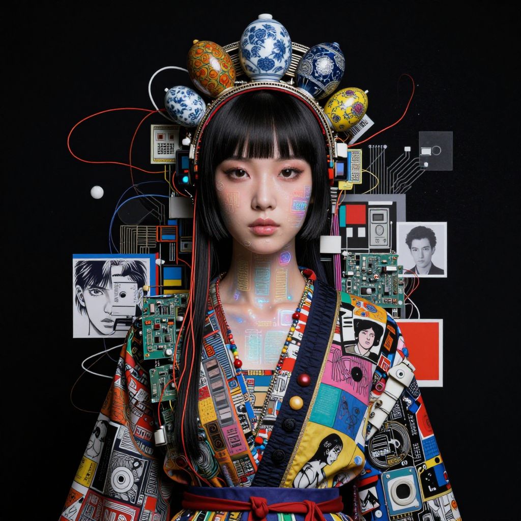 This digital artwork features a young Asian woman with straight, black hair and bangs, wearing a colorful, patterned kimono adorned with various graphics and images. Her face is expressionless, with subtle makeup highlighting her eyes and lips. She wears a headpiece with glowing, orb-like decorations in yellow, blue, and silver. The background is black, filled with abstract, multicolored geometric shapes, black-and-white portraits, and circuit-like patterns. Red and blue lines intersect the image, adding a sense of complexity and modernity. The style blends traditional Japanese elements with contemporary digital art techniques.