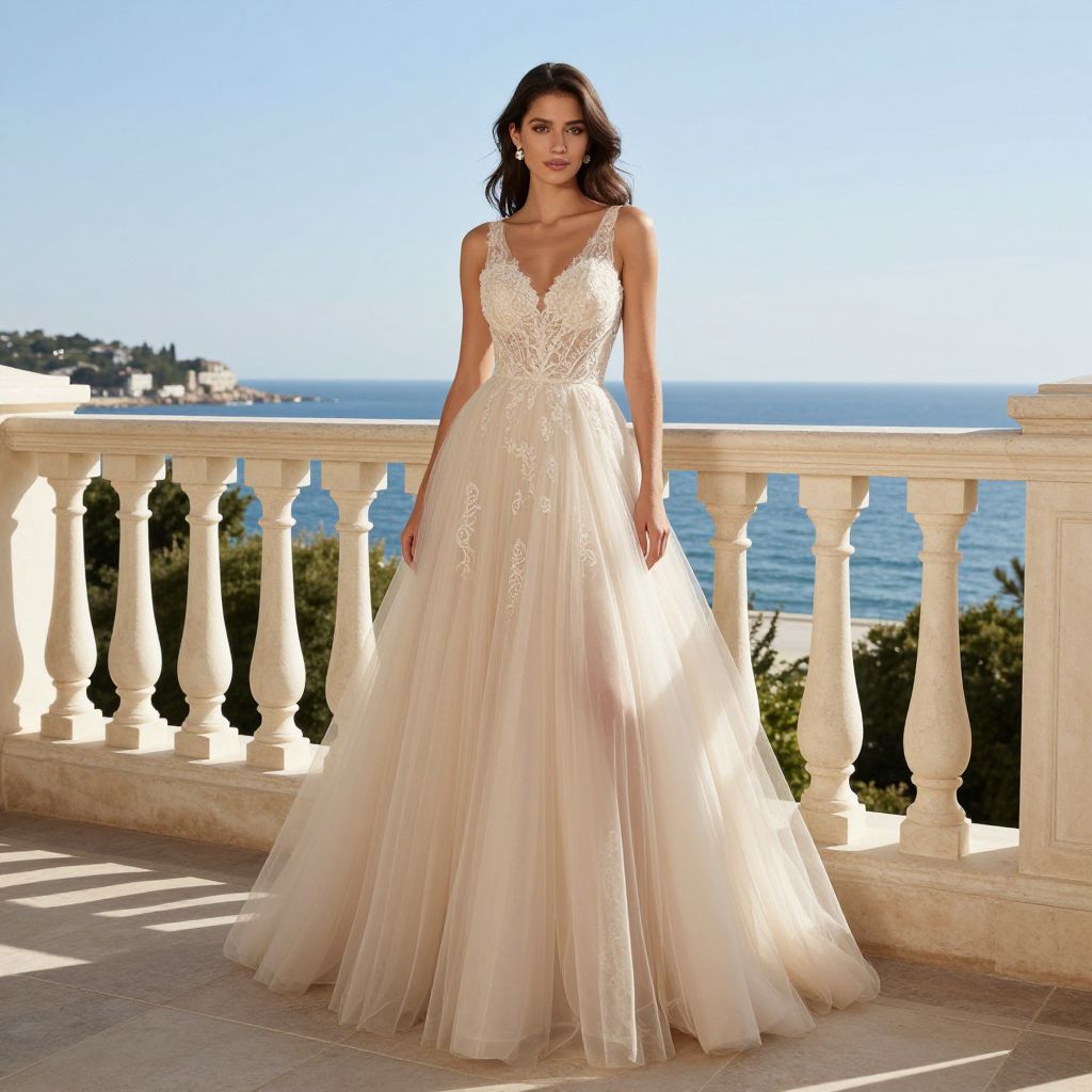 Photograph of a slender, fair-skinned woman with long, wavy brown hair, standing on a sunlit balcony overlooking the ocean. She wears a floor-length, cream-colored, lace and tulle wedding gown with a deep V-neckline and cap sleeves. The lace is intricately embroidered on the bodice, while the tulle skirt is full and flowing. The balcony has a white, classical-style balustrade, and the background includes a clear blue sky, calm sea, and distant coastal buildings. The woman's makeup is subtle, with a focus on her red lipstick, and she gazes confidently at the camera.