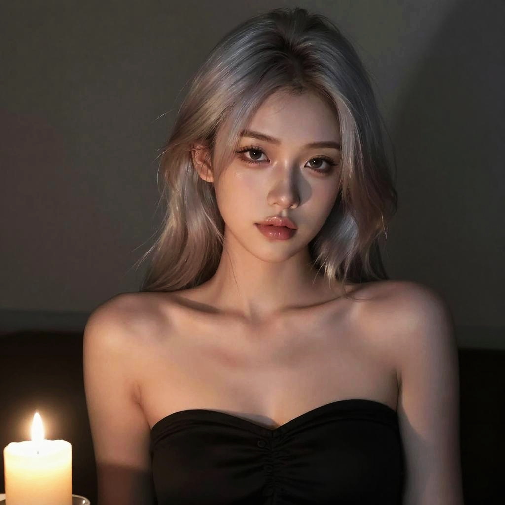 Realistic photo.Digital art of a woman wearing a strapless black top, with light-brown hair, candlelight, photorealistic with detailed shadows realistic photo