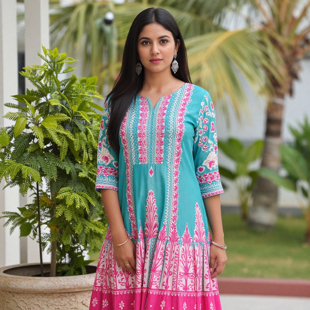 Female model with long black hair, wearing a turquoise and pink outfit with a pink and white pattern. She is standing in front of a potted plant with green leaves, and there are palm trees in the background.