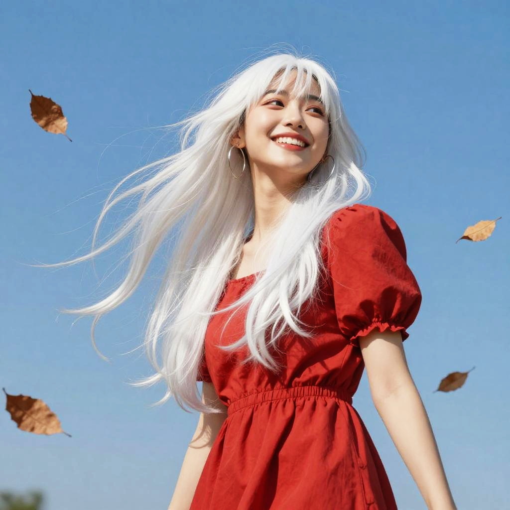 Photograph of a smiling young woman with long, flowing white hair, wearing a vibrant red dress with puffed sleeves. She's standing against a clear blue sky, with brown leaves swirling around her. She has large, silver hoop earrings and is looking upwards, exuding joy and freedom. The bright sunlight highlights her hair and dress, creating a lively, carefree atmosphere.