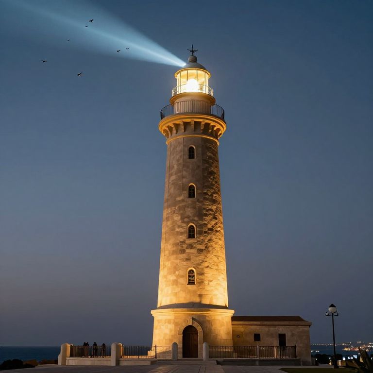 Photograph of a tall, cylindrical lighthouse illuminated with warm yellow light, standing against a deep blue evening sky. The lighthouse, made of stone, features a small, brightly lit cylindrical top with a beam of light cutting through the darkness, casting a white glow. Birds are silhouetted in the sky to the left. The base of the lighthouse has a small, square building with an arched entrance. A black iron fence surrounds the structure, and a streetlamp is visible to the right. The overall scene has a serene, coastal vibe.