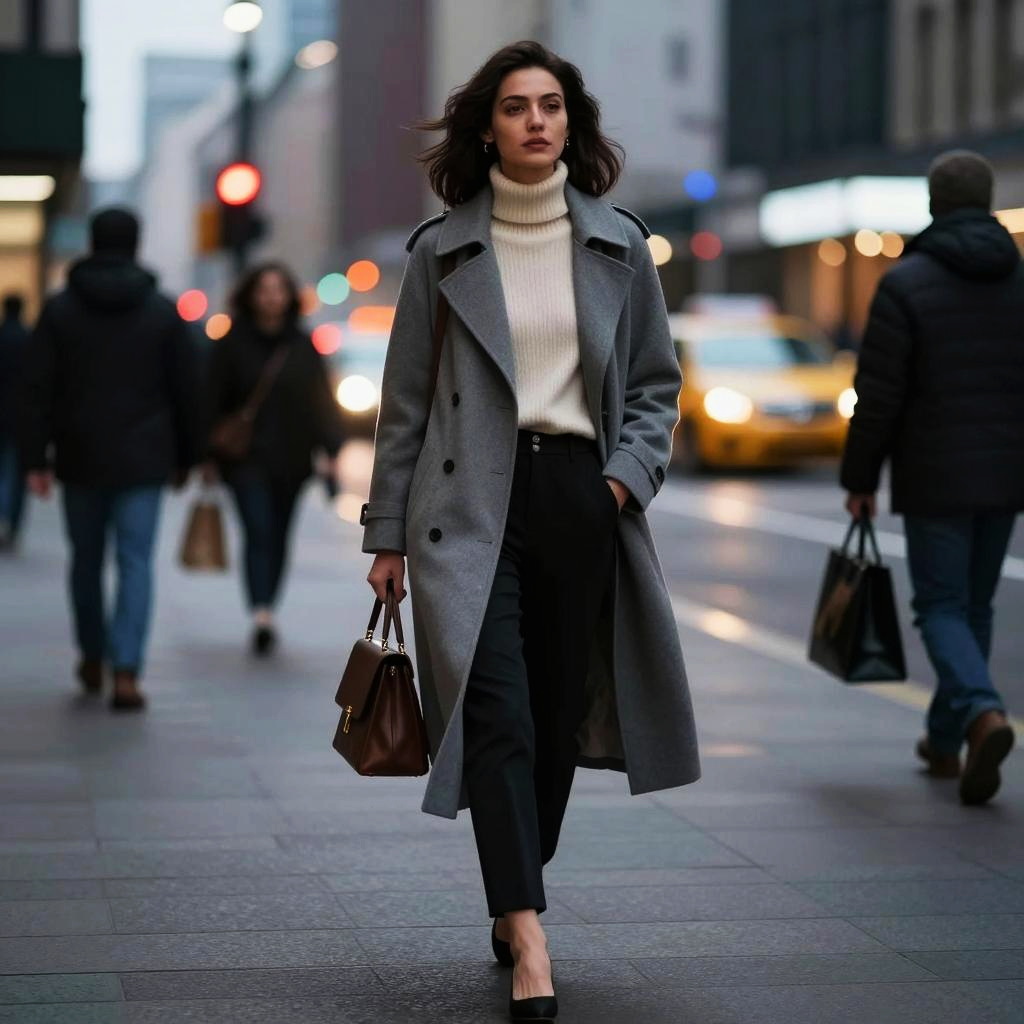 Portrait of a fashionable young woman walking confidently on a city street during the evening. She is wearing a long grey coat over a white turtleneck sweater, black pants, and black heels, carrying a brown handbag. The urban background features blurred city lights, pedestrians, and a yellow taxi, creating a colorful and lively nighttime atmosphere.