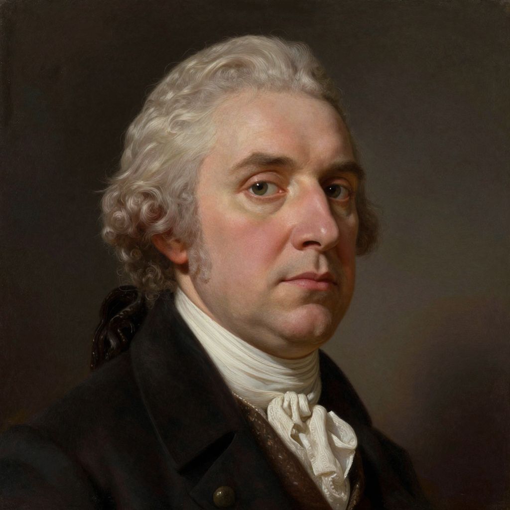 This is a detailed, realistic oil painting portrait of an older Caucasian man with fair skin and white, wavy hair. He has a serious, slightly stern expression with light brown eyes. He wears a black coat over a white cravat and white shirt, typical of 18th-century fashion. The background is a dark, gradient shade that highlights the subject's face and attire. The texture of the painting is smooth with careful attention to light and shadow, enhancing the realistic depiction of the man's features and clothing. The style is classical and resembles 18th-century portraiture.