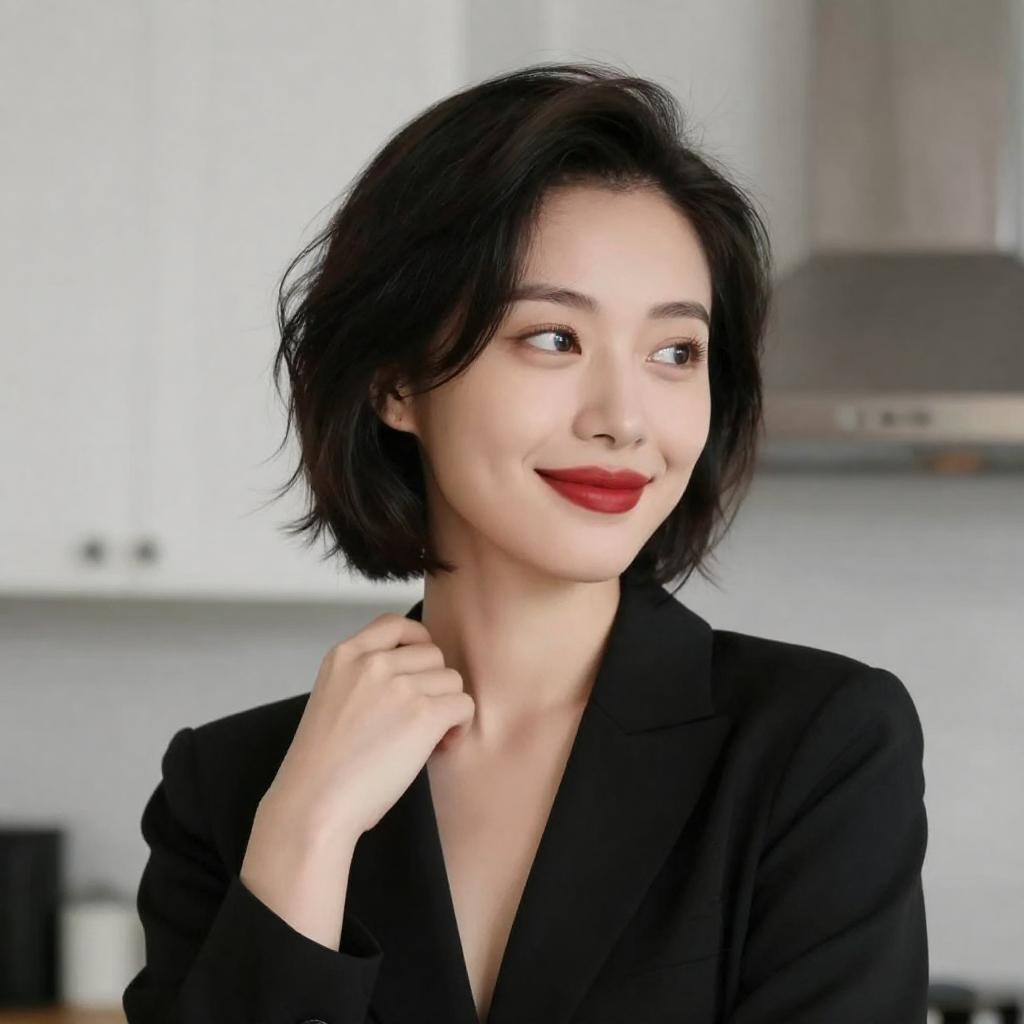 Photograph of an Asian woman with short black hair, wearing a tight, black, short-sleeved dress with subtle glitter. She stands in a dimly lit room, her right hand touching her hair, left arm resting on a dark surface. Her expression is confident, with slightly parted red lips. The background is dark and indistinct.