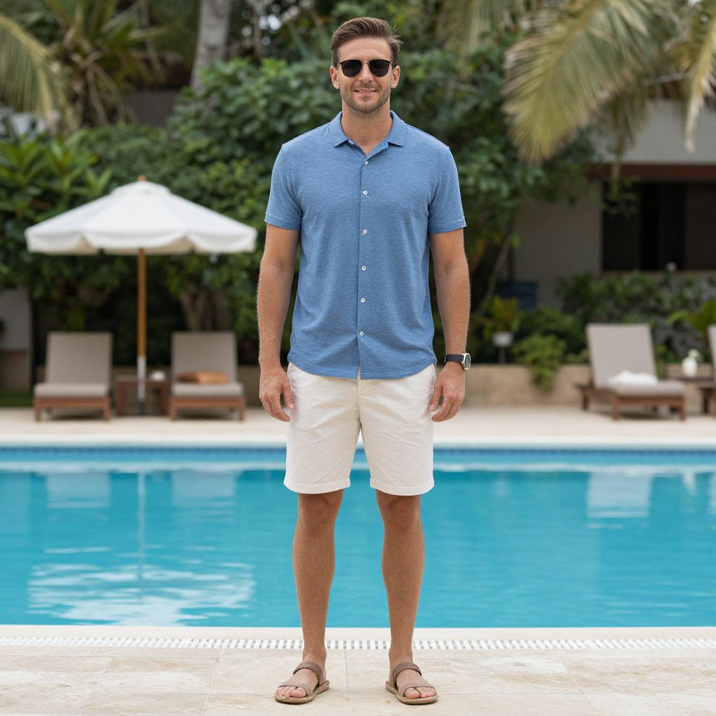 Resort Casual Attire, man standing in front of a pool wearing a blue shirt