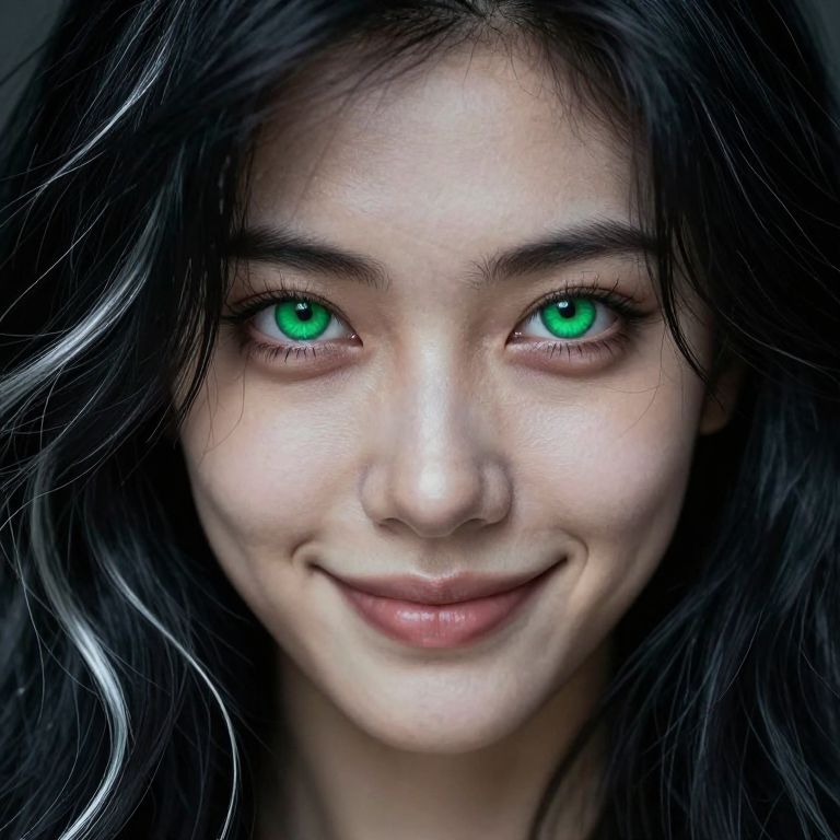 This is a highly detailed, digital photograph of a young woman with a light skin tone and striking, vivid green eyes. Her long, wavy black hair with subtle white highlights frames her face. She has a slight, confident smile, and her makeup is minimal, emphasizing her natural beauty. The background is dark and blurred, focusing attention on her face. The lighting highlights her smooth skin and the bright color of her eyes, creating a striking contrast. The image has a hyper-realistic style, capturing fine details like the texture of her hair and the subtle shadows on her face.
