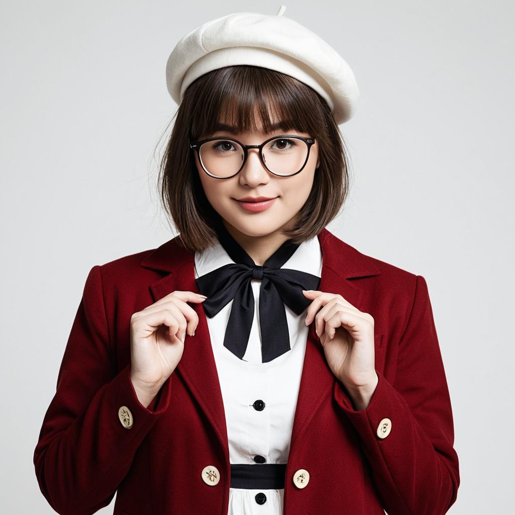 Photograph of an Asian woman with fair skin and straight, dark brown bob haircut, wearing black-rimmed glasses. She dons a white beret, a maroon blazer with gold buttons, and a white shirt with a black bow tie. She holds the lapels of her blazer with both hands, slightly pulling them outward. The background is a plain white, making her outfit and features stand out prominently. Her expression is neutral, with a subtle, closed-mouth smile. The image has a high contrast and sharp focus, emphasizing the textures and colors of her clothing.