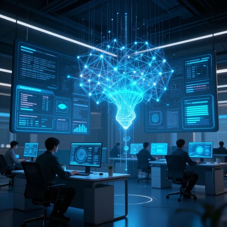 Photograph of a futuristic, blue-lit tech office. Central focus is a glowing, wireframe blue lightbulb-shaped hologram hanging from the ceiling. Surrounding it are floating digital screens displaying various tech data and graphs in blue and white. Silhouetted against the light are five seated individuals, working on laptops, with their back to the camera. The room features sleek, modern desks and is illuminated by linear ceiling lights. The overall ambiance is high-tech and futuristic, with a strong blue color scheme dominating the scene.