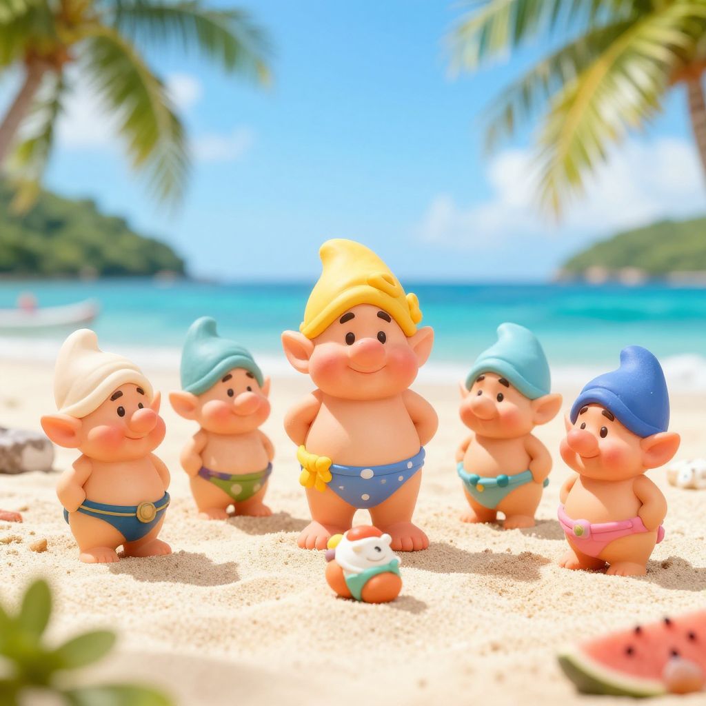 Dwarf bikini fashion shoot, tiny fantasy characters posing on a tropical beach, vibrant colors, detailed textures, bright sunlight, whimsical and playful atmosphere