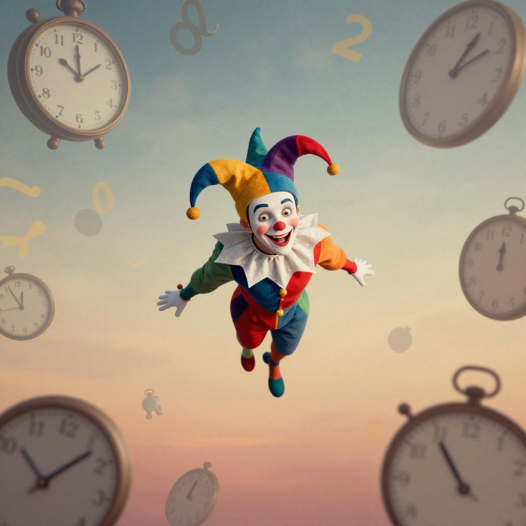 A whimsical portrait in a playful, surreal style depicts a jester-like figure soaring through a dreamlike sky filled with floating abstract shapes resembling timepieces and numerals, evoking the essence of a surrealist fairy tale. From an aerial perspective, viewers are captivated by this enigmatic character's mischievous grin and colorful costume, juxtaposed against the surreal backdrop that symbolizes the ephemeral nature of time. The gradient transitions harmoniously from the jester's vibrant, lively form to the more muted, abstract shapes of clocks and numbers, creating an emotional spectrum that evokes both wonder and introspection as one contemplates the passage of time.
