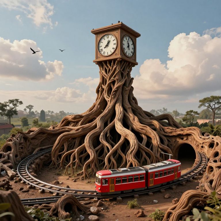Upside-down clock tower emerges from the earth, its massive roots sprawling outward, as two miniature red trams glide along suspended tracks that weave through the intricate network of tunnels carved into the gnarled wood, all under a serene sky dotted with fluffy clouds and soaring birds.