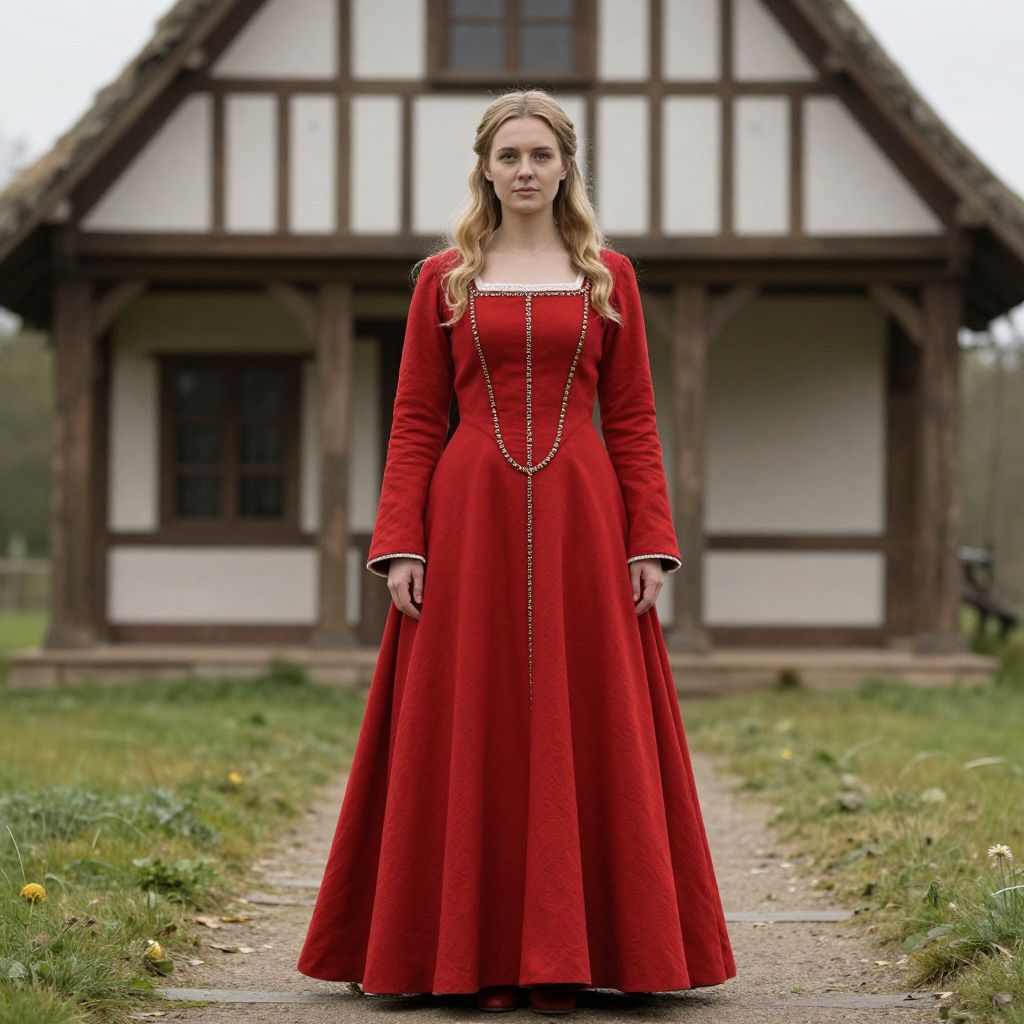 Red Medieval Dress Costume, woman in red robe standing in front of a house