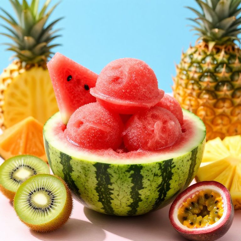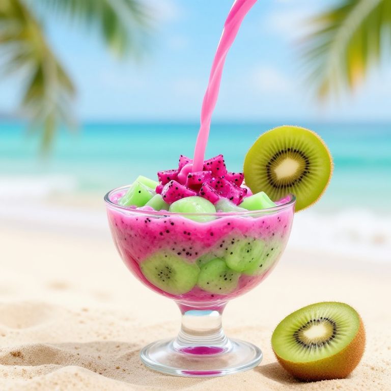 Batido exotic dragon fruit and kiwi blend, vividly colored in pinks and greens, poured into a transparent glass bowl with decorative cut fruits on the rim, tropical beach background with soft waves and sandy shore, dreamy and artistic