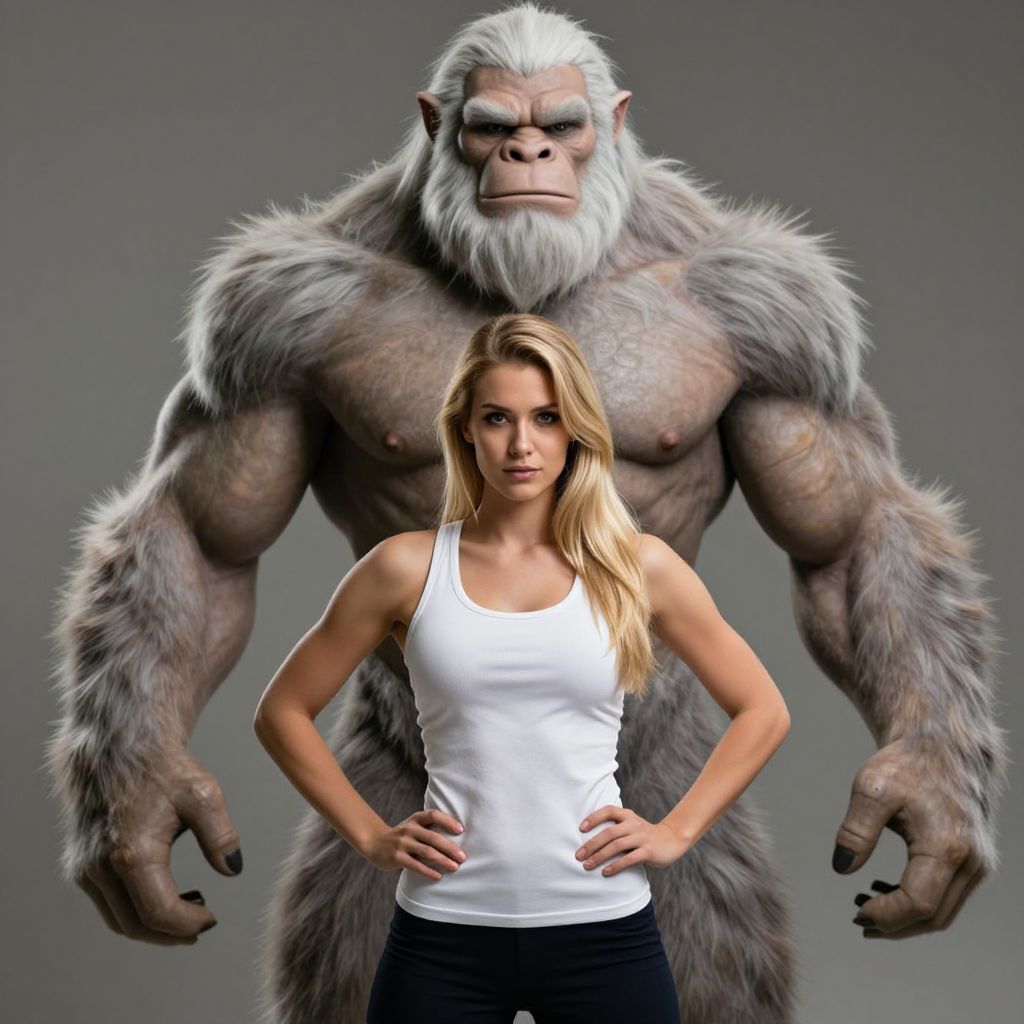 In the image, a muscular, humanoid creature resembling a yeti with long white hair and large muscles stands prominently in the background. The creature's powerful physique is accentuated by its broad shoulders and well-defined arms. In the foreground, a young woman with long blonde hair and a fit, athletic build is depicted. She is dressed in a white tank top and dark pants, exuding a sense of strength and confidence. The woman's posture is assertive, with her hands on her hips, suggesting a sense of determination. The background is a muted, grayish tone, which helps to highlight the subjects in the foreground and background. The overall composition creates a dynamic interplay between the powerful yeti and the confident woman, emphasizing their contrasting yet complementary strengths.