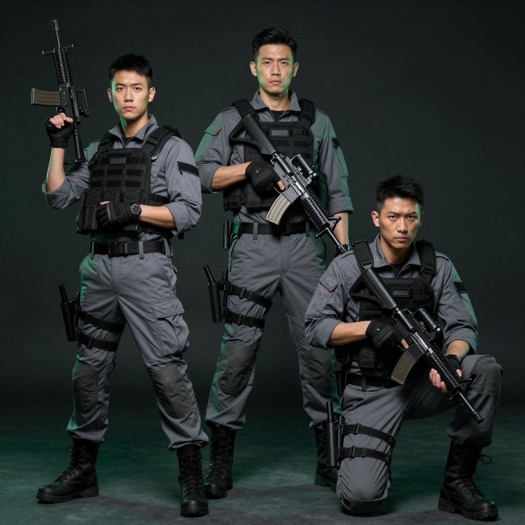 Three men in gray military-style jumpsuits with tactical gear, holding large firearms. They crouch in a dark, green-lit environment. The man on the left stands with a gun raised, the middle man stands with a serious expression, and the right man kneels with a gun resting on his thigh. The background is dark and minimal.