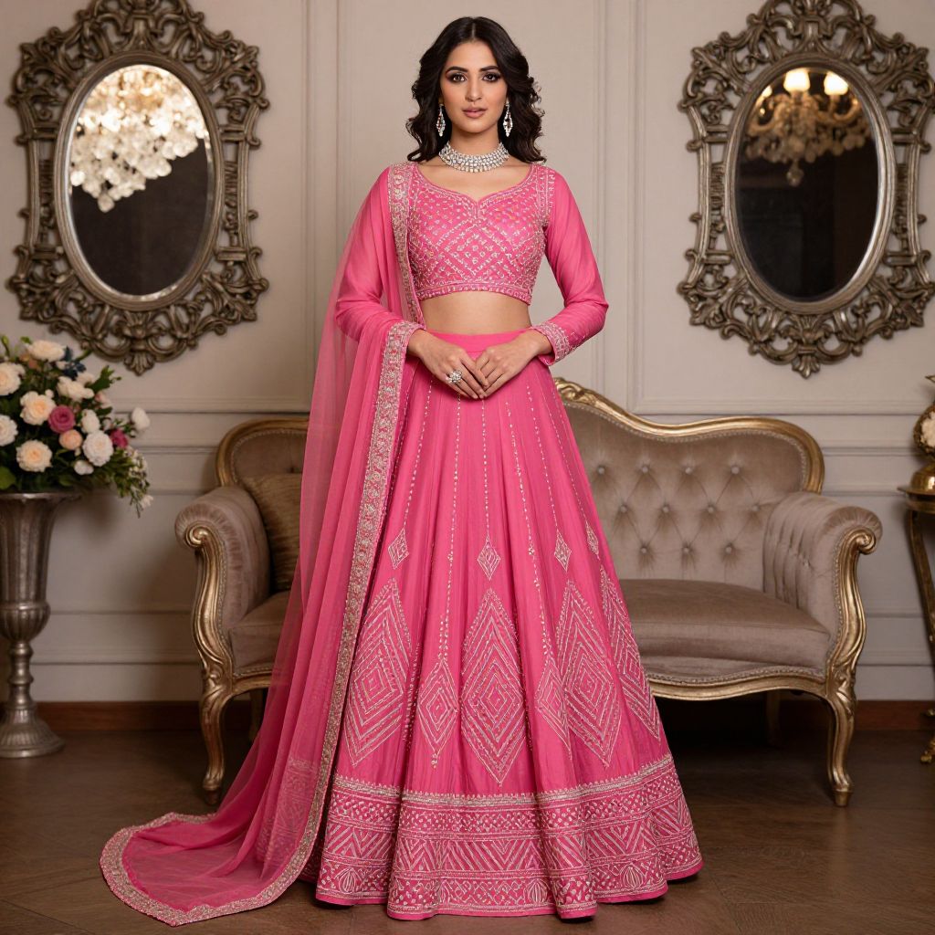 Elegantly poised woman wearing a vibrant pink lehenga with intricate geometric embroidery, complemented by a sheer dupatta, set against a sophisticated backdrop featuring two ornate mirrors, a floral arrangement, and a classic tufted armchair.