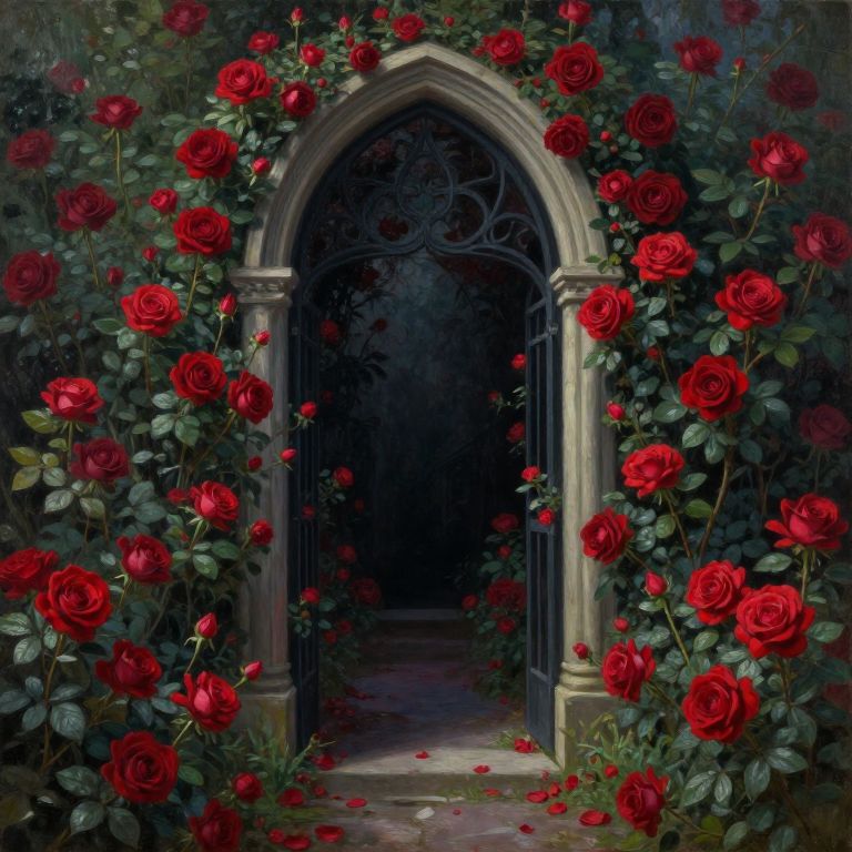 Digital painting of a gothic archway adorned with vibrant red roses and dark green leaves, surrounded by a dense floral frame, leading into a shadowy