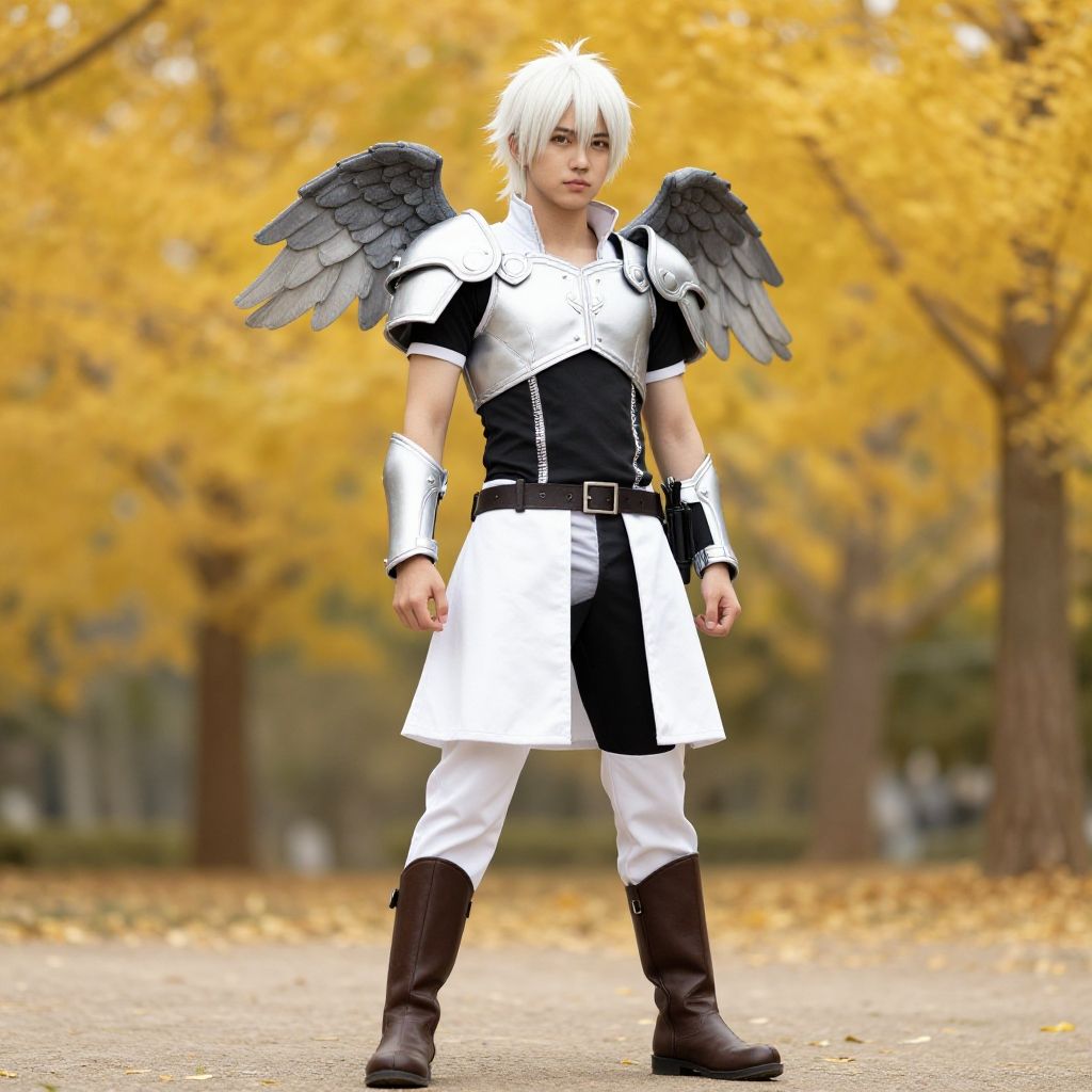 Young male cosplayer with white hair, black-and-white armor, gray angel wings, and brown boots stands on a autumn path.