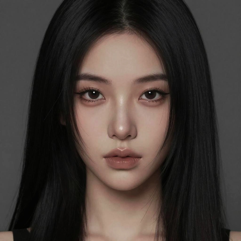 Digital portrait of an East Asian woman with long black hair, pale skin, and intense brown eyes, set against a dark gray background.