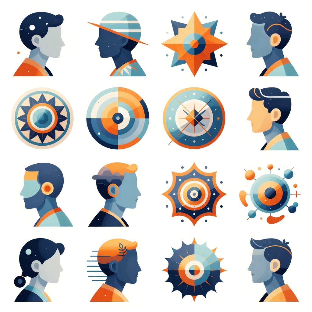 This is a digital illustration featuring 16 stylized, side-profile headshots of diverse individuals, each paired with a unique, geometric symbol. The headshots are rendered in a vibrant, flat design with predominantly blue, orange, and white colors. The symbols include stars, circles, and abstract shapes, each incorporating orange and blue elements. The background is white, making the colorful elements stand out. The headshots vary in hairstyle, from short to medium, and include both men and women, with distinct facial features and accessories like hats. The overall style is modern and minimalist, emphasizing bold colors and clean lines.