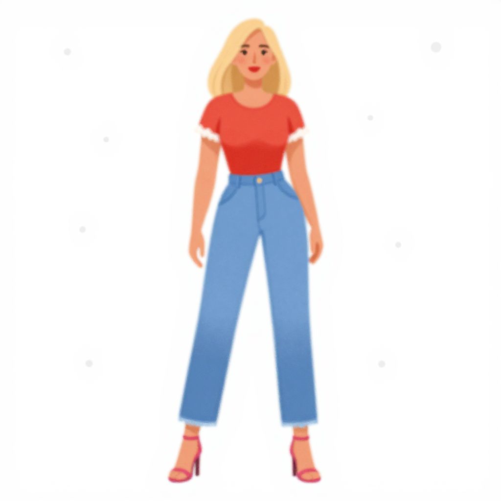 Digital illustration of a blonde woman with red shirt, blue high-waisted pants, and pink sandals, standing against a white background.